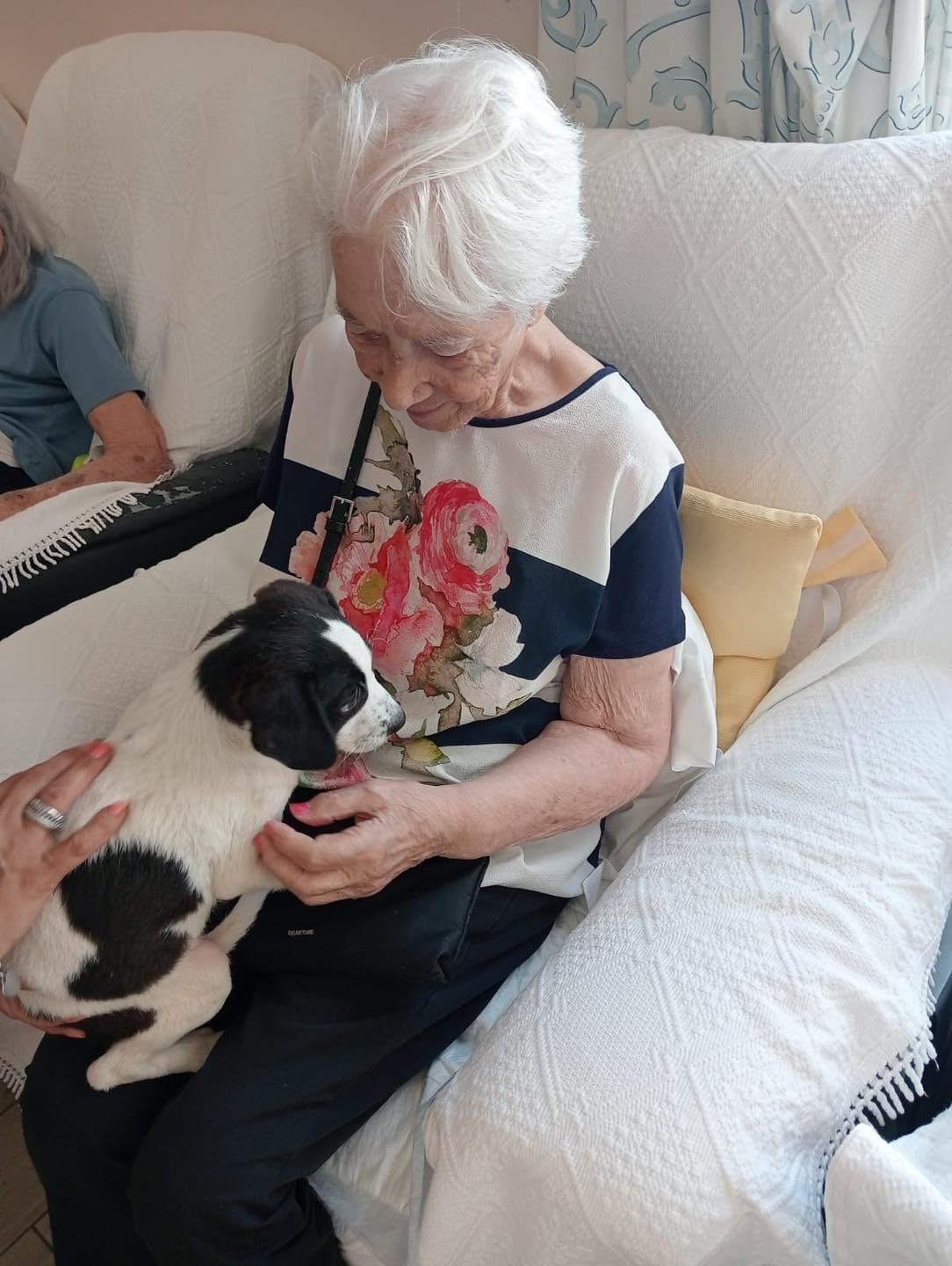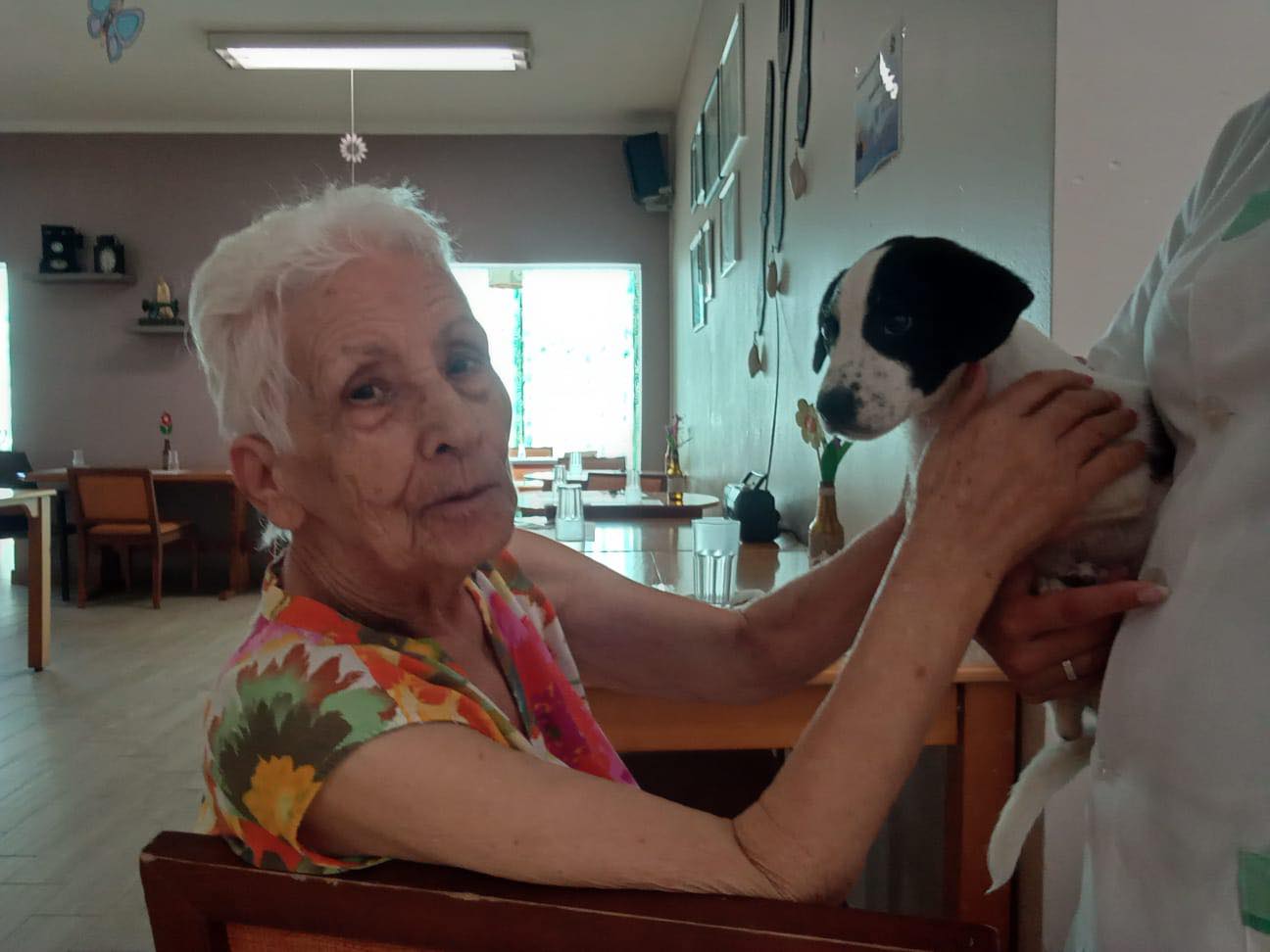 Os nossos residentes receberam-nos com entusiasmo e emoção. Houve quem recordasse os seus antigos companheiros de estimação e quem, com um sorriso nos lábios, estendesse a mão para uma festa carinhosa. Os cachorrinhos tranquilos, fizeram questão de dar atenção a todos.