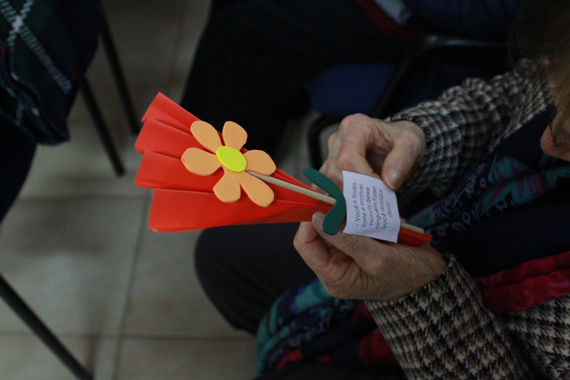 Os nossos senhores prepararam uma surpresa muito especial: ofereceram flores feitas pelos próprios utentes, acompanhadas de palavras e frases motivacionais dedicadas às mulheres. Além disso, as nossas utentes também criaram com muito carinho sabonetes em forma de coração.